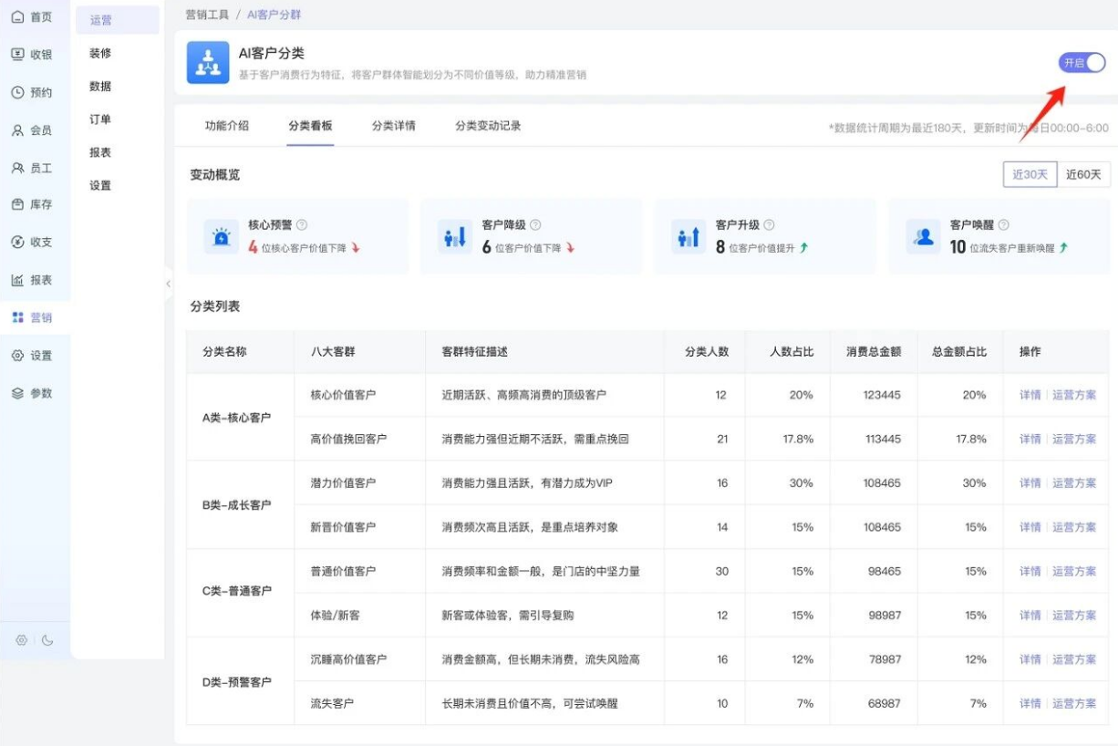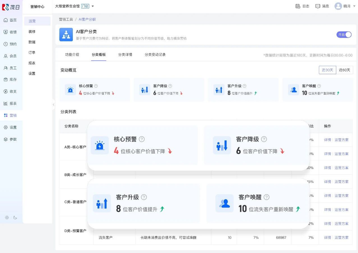 茂日AI客户分类已经替您写好答案——根据门店客户最近消费时间、消费频次、消费金额进行分类,快速生成核心客户、成长客户、普通客户、预警客户四大标签库,帮您锁定“隐形财神”、一键唤醒流失、一步到位锁住客户。